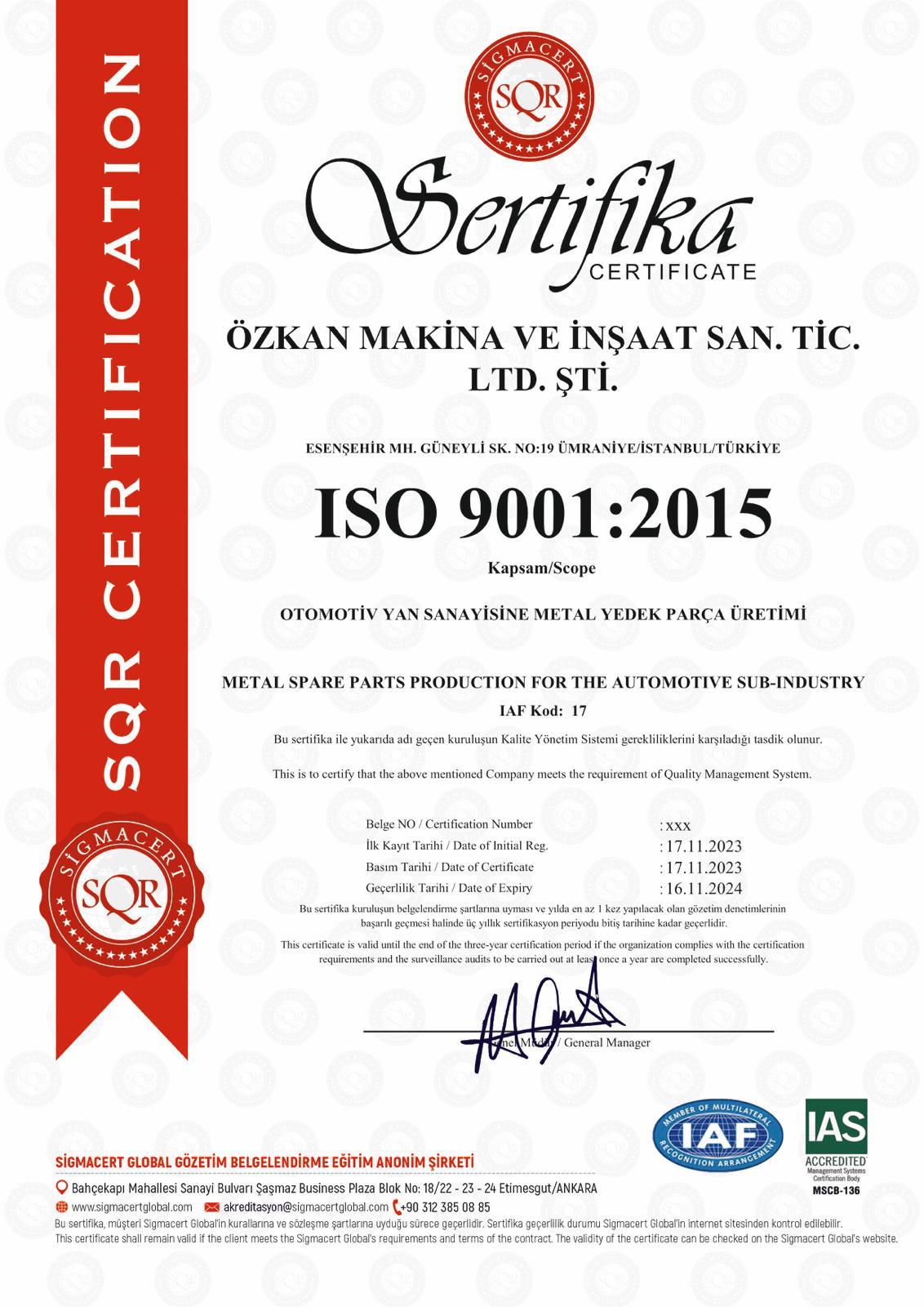 Müşteri istek ve ihtiyaçlarına duyarlı olan ÖZKAN MAKİNA, müşteri memnuniyetini en üst seviyede tutmak için sürekli olarak performans ve proses iyileştirme çalışmaları yapmaktadır. Firma çalışanlarımıza, kişisel gelişmelerinin ve kalite yönetim sisteminin her aşamasında sorumluluk almalarının sağlanabilmesi için düzenli eğitimler verilmesi kalite politikamızın en önemli maddelerinden biridir. Kalite düzeyimizi en üst seviyede sürekli kılabilmek için gelişen teknolojiyi kullanmamız gerekliliğine inanmaktayız. Kalite ve İşletme hedeflerine ulaşmak için yönetim ve tüm çalışanlar bir ekip olarak hareket etmektedirler.